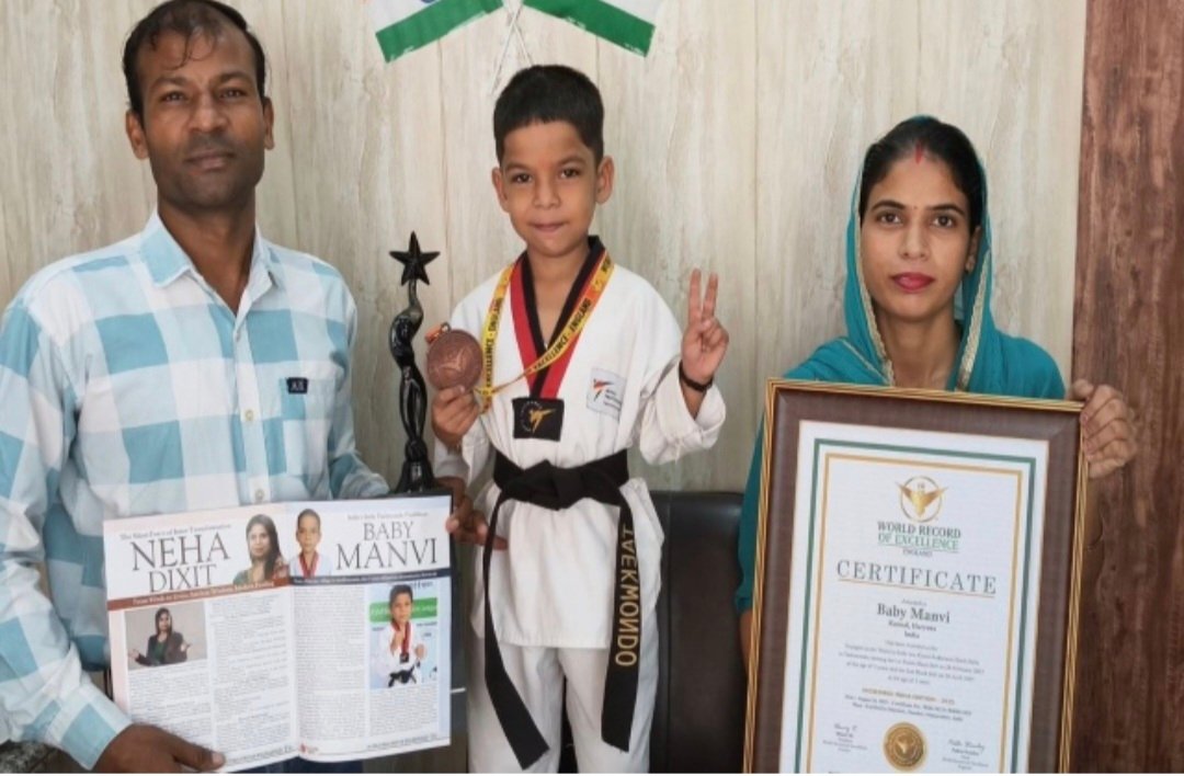 करनाल(एजेंसी) करनाल जिले के बागपत गांव की महज 5 साल की मानवी ने ताइक्वांडो में असाधारण उपलब्धि हासिल कर विश्व रिकॉर्ड बना डाला है। मानवी को 24 अगस्त को मुंबई में वर्ल्ड रिकॉर्ड ऑफ एक्सीलेंस लंदन बुक की ओर से सम्मानित किया गया। उसकी इस ऐतिहासिक उपलब्धि के लिए अब उसका नाम वर्ल्ड रिकॉर्ड ऑफ एक्सीलेंस लंदन बुक में दर्ज हो चुका है। वह ताइक्वांडो में सबसे कम उम्र में दो ब्लैक बेल्ट हासिल करने वाली विश्व की सबसे कम उम्र की खिलाड़ी बन गई है।