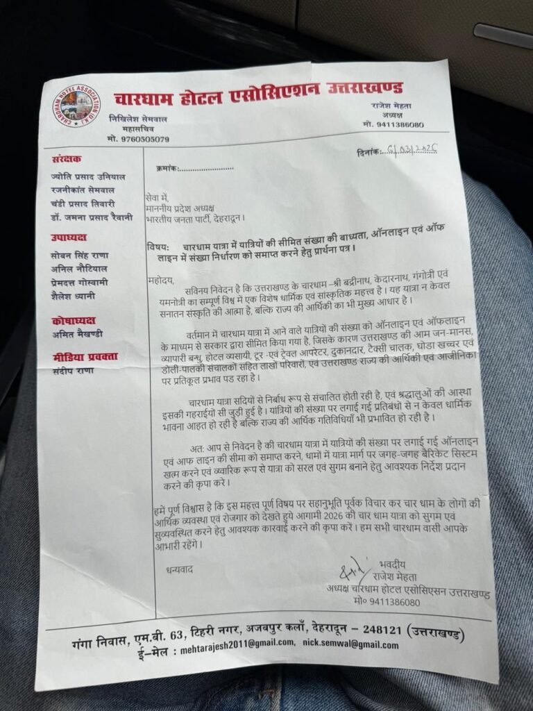 कहा कि चारधाम यात्रा सदियों से निर्बाध रूप से संचालित होती रही है एवं श्रद्धालुओं की आस्था इसकी गहराईयों सी जुड़ी हुई है। यांत्रियों की संख्या पर लगाये गये प्रतिबंधों से न केवल धार्मिक भावना आहत हो रही है बल्कि राज्य की आर्थिक गतिविधियाँ भी प्रभावित हो रही है। उन्होंने मांग की कि चारधाम यात्रा में यात्रियों की संख्या पर लगाई गई ऑनलाइन एवं आफ लाइन की सीमा को समाप्त करने, धामों में यात्रा मार्ग पर जगह-जगह बैरिकेट सिस्टम खत्म करने एवं व्य्वारिक रूप से यात्रा को सरल एवं सुगम बनाने हेतु आवश्यक निर्देश जारी किये जाए।