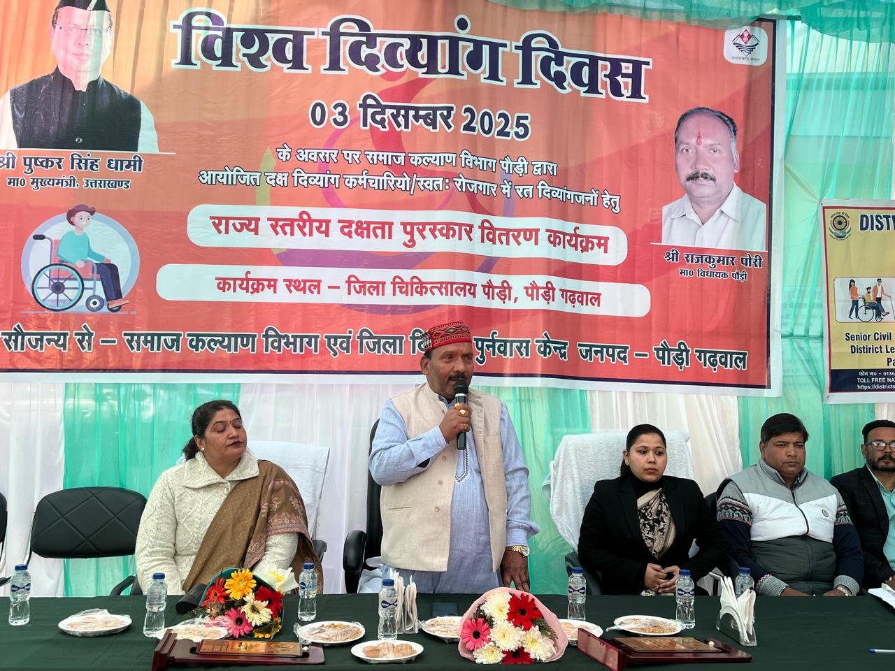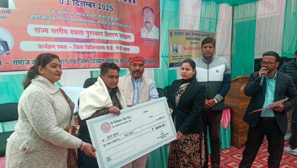 पौड़ी। विश्व दिव्यांग दिवस के अवसर पर समाज कल्याण विभाग के तत्वावधान में जिला चिकित्सालय पौड़ी में सम्मान कार्यक्रम आयोजित किया गया। कार्यक्रम में मुख्य अतिथि के रूप में उपस्थित विधायक राजकुमार पोरी सहित अन्य अतिथियों ने दक्ष दिव्यांगजनो को सम्मानित किया।