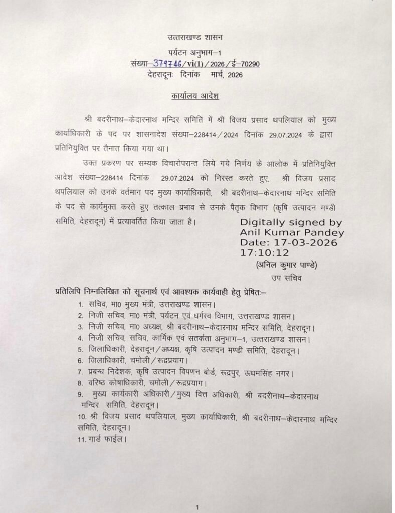 देहरादून। उत्तराखंड के सबसे प्रतिष्ठित धार्मिक संस्थानों में गिने जाने वाले बदरी-केदार मंदिर समिति (बीकेटीसी) में हाल के दिनों में जारी घमासान के बीच सरकार ने बड़ा प्रशासनिक फैसला लेते हुए समिति के मुख्य कार्यकारी अधिकारी (सीईओ) विजय थपलियाल की प्रतिनियुक्ति समाप्त कर दी है। उन्हें तत्काल प्रभाव से उनके मूल विभाग कृषि उत्पादन मंडी समिति में वापस भेज दिया गया है। अब देखना यह होगा कि इस पद पर नियमित या प्रतिनियुक्ति पर किसे तैनात किया जाता है।