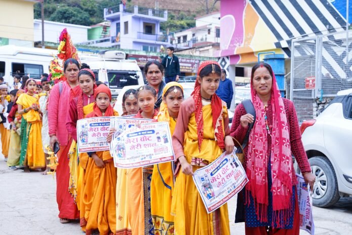 ‘फूल देई, वोट देई’ अभियान के तहत जनपद के तीनों विकासखंडों में बच्चे लोक परंपरा निभाते हुए घर-घर देहरी पर फूल बिखेर रहे हैं और साथ ही लोकतंत्र के महापर्व—मतदान—का संदेश भी दे रहे हैं। वे लोगों को प्रेरित कर रहे हैं कि जैसे घर की देहरी पर फूल डालना शुभ माना जाता है, वैसे ही मतदान करना भी हर नागरिक का कर्तव्य है।