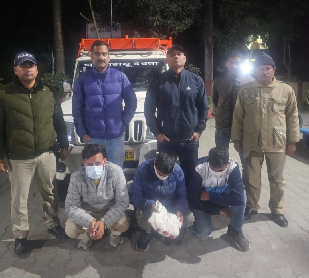 देहरादून। एसटीएफ की एंटी नार्कोटिक्स टास्क फोर्स (A.N.T.F.) ने थाना विकासनगर पुलिस के साथ संयुक्त अभियान में 1.505 किग्रा0 चरस सहित 3 नशा तस्करों को गिरफ्तार किया है। गिरफ्तार अभियुक्तों की पहचान दिनेश, कुन्दन चौहान, और पंकज के रूप में हुई है, जो कालसी जनपद देहरादून के निवासी हैं।