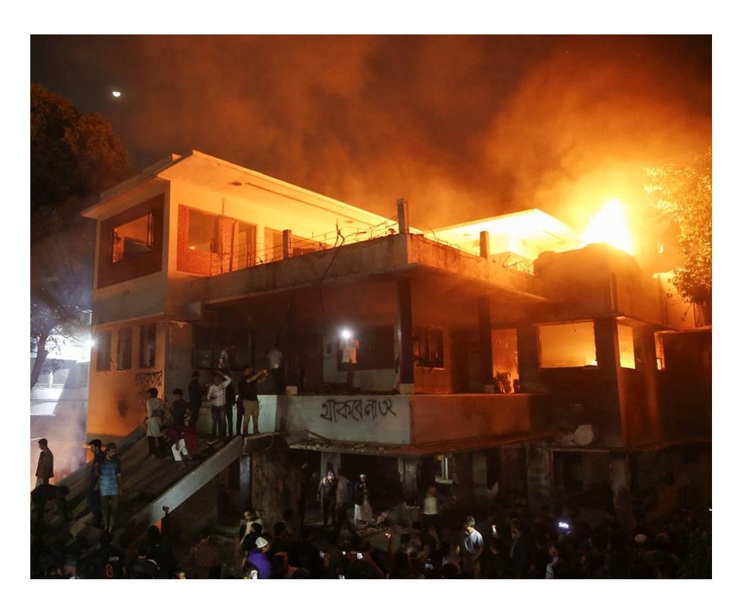 सोशल मीडिया पर युवाओं के नेतृत्व में भीड़ द्वारा अवामी लीग विरोधी नारे लगाने और इमारत में तोडफ़ोड़ करने के वीडियो वायरल हो गए।