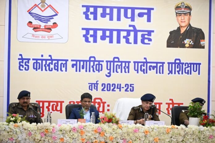 देहरादून,12मार्च 2025: जनपद देहरादून में चल रहे मुख्य आरक्षी नागरिक पुलिस पदोन्नति प्रशिक्षण का आज दिनांक: 12-03-25 को पुलिस लाइन देहरादून में विधिवत समापन हुआ। समापन समारोह में श्री दीपम सेठ, पुलिस महानिदेशक उत्तराखण्ड महोदय द्वारा बतौर मुख्य अतिथि शिरकत की गई। समापन समारोह के दौरान अपने सम्बोधन में पुलिस महानिदेशक महोदय द्वारा मुख्य आरक्षी को पुलिस सिस्टम की बेहद अहम कड़ी बताया तथा पदोन्नति प्रशिक्षण प्राप्त किये पुलिस कर्मियों को पदोन्नति पर शुभकामनाएं देते हुए उनसे भविष्य में भी अपने अनुभवों के आधार पर इसी प्रकार अनुशासन तथा पूर्ण निष्ठा से अपने दायित्वों का निर्वहन करने की अपेक्षा की।