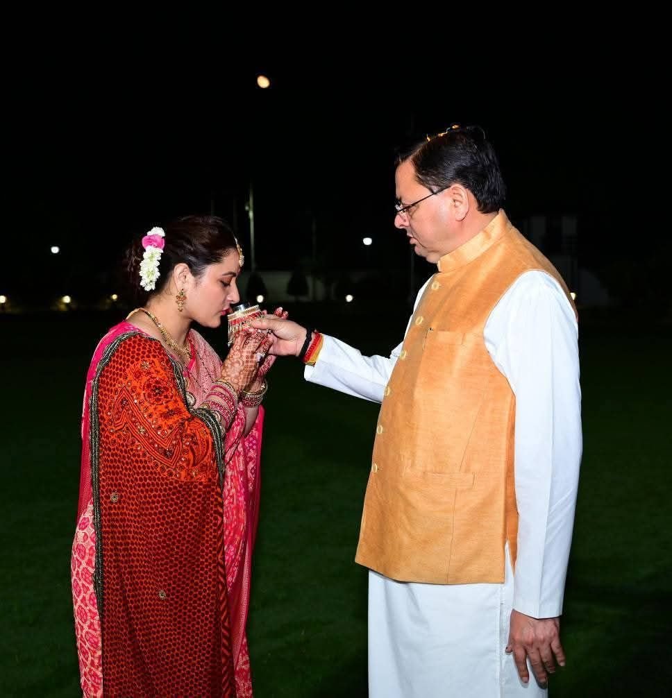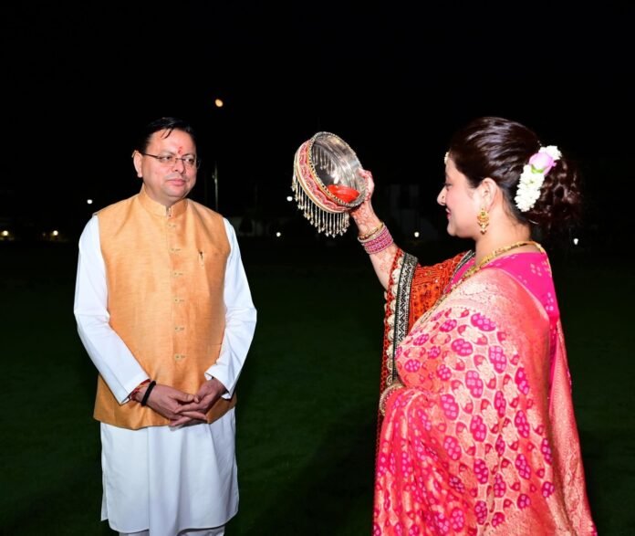 देहरादून: उत्तराखंड के मुख्यमंत्री पुष्कर सिंह धामी और उनकी धर्मपत्नी गीता धामी ने बुधवार को करवा चौथ का व्रत पारंपरिक श्रद्धा और उत्साह के साथ मनाया। यह कार्यक्रम मुख्यमंत्री आवास पर आयोजित किया गया, जहाँ दंपति ने विधि-विधानपूर्वक पूजा-अर्चना की।