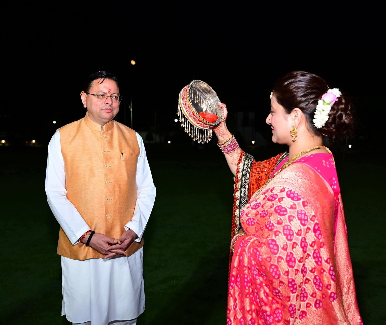 रात्रि में, चंद्रोदय के बाद, गीता धामी ने चंद्रमा को अर्घ्य देकर विधिपूर्वक व्रत का समापन किया। इस दौरान मुख्यमंत्री धामी उनके साथ थे।