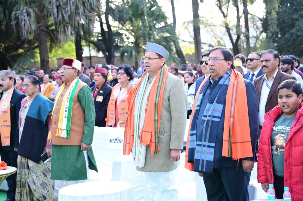 देहरादून। गणतंत्र दिवस के पावन अवसर पर देहरादून के गांधी पार्क में भारत विकास परिषद द्वारा आयोजित सामूहिक वंदे मातरम गायन कार्यक्रम में मुख्यमंत्री पुष्कर सिंह धामी ने शिरकत की। वंदे मातरम के 150 वर्ष पूर्ण होने पर सीएम ने राष्ट्रभक्ति, एकता और संविधान की सांस्कृतिक महत्ता पर जोर दिया।