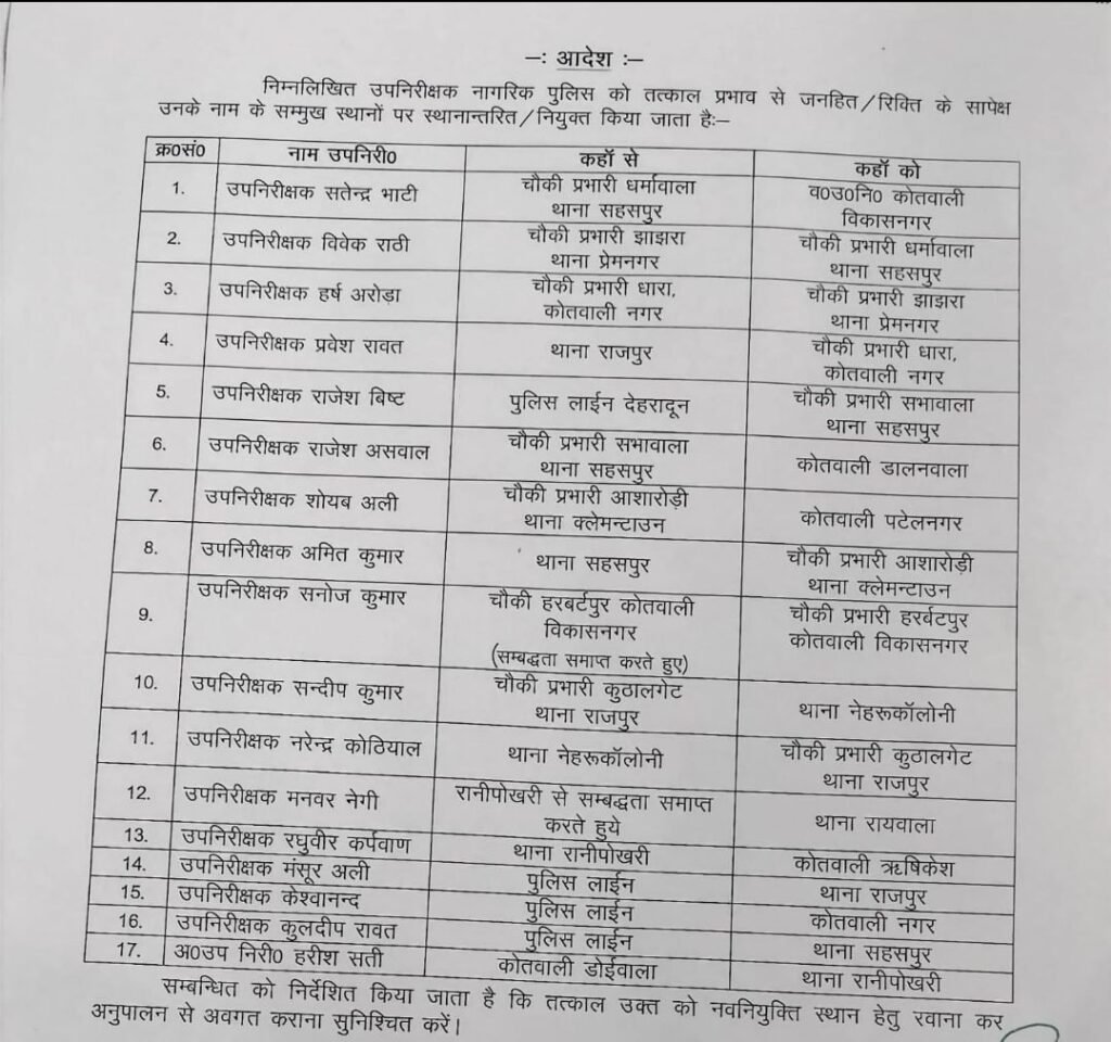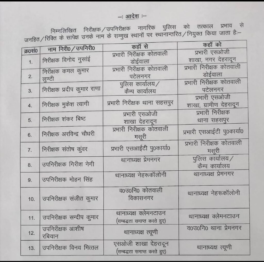 देहरादून: वरिष्ठ पुलिस अधीक्षक द्वारा निरीक्षकों और उप निरीक्षकों के बम्पर तबादले