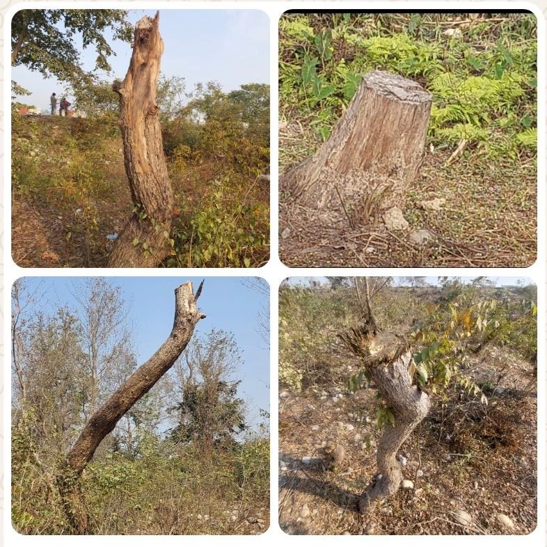 हालिया तस्वीरें इस प्रक्रिया की पूरी तस्वीर पेश करती हैं। एक तस्वीर में मजबूत शीशम पेड़ की लोपिंग (शाखाओं को बड़े पैमाने पर काटना) साफ नजर आ रही है — यह पेड़ को कमजोर करने का प्रारंभिक चरण है। दूसरी तस्वीर में उसी पेड़ का एक बड़ा हिस्सा पहले ही काट लिया गया दिख रहा है।