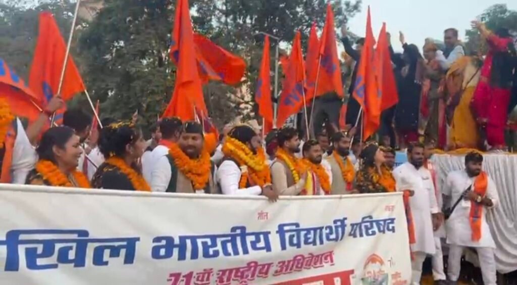 Dehradun : The 71st National Conference of Akhil Bharatiya Vidyarthi Parishad (ABVP) is underway from 28 to 30 November at the ‘Bhagwan Birsa Munda Nagar’, set up at the Parade Ground in Devbhoomi, Uttarakhand. A 4.5 km grand Shobhayatra was taken out from the conference venue to Darshanlal Chowk. With the participation of over 1500 students representing all states of the country, the procession truly showcased a ‘Mini India’. The youth-filled streets were greeted enthusiastically by the citizens of Devbhoomi, who raised spirited chants of “Bharat Mata Ki Jai!”