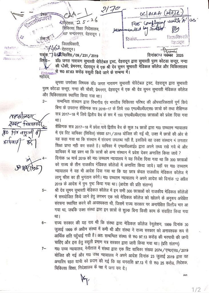 देहरादून। जिले के बड़े बकायेदारों के खिलाफ चलाए जा रहे विशेष अभियान के तहत जिला प्रशासन ने सुभारती समूह पर अब तक की सबसे बड़ी कार्रवाई की है। जिलाधिकारी सविन बंसल के निर्देशों के अनुपालन में लंबित बकाया वसूली के तहत रू 87.50 करोड़ की कुर्की प्रक्रिया प्रारंभ कर दी गई है।