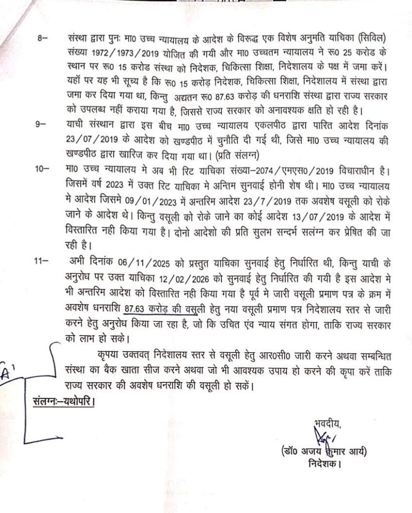संस्थान को 6 वर्षों से 300 छात्रों से पूर्ण शुल्क वसूलने के बावजूद संरचना विहीन संस्थान में रखना भारी पड़ गया है, जिला प्रशासन ने वसूली वारंट जारी कर दिया है, अगले कुछ ही दिवसों में संस्थान का बैंक खाता सीज संपत्ति कुर्क करने की कार्रवाई की जा सकती है।चिकित्सा शिक्षा निदेशक ने डीएम से की सिफारिशचिकित्सा शिक्षा निदेशक ने संस्थान से पूर्ण वसूली के जाने के सिफारिश जिलाधिकारी को की थी।