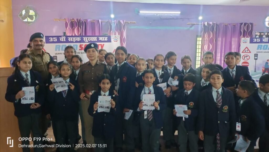 देहरादून,07/02/2025 वर्तमान में सम्पूर्ण भारत में आम जन को यातायात नियमो के प्रति जागरूक करने के लिए चलाये जा रहे सडक सुरक्षा माह के अन्तर्गत दून पुलिस द्वारा आज दिनांक 07/02/2025 को स्कूली छात्र छात्राओं के मध्य जाकर यातायात नियमो के प्रति जागरूकता अभियान चलाया गया। अभियान के दौरान पुलिस लाईन स्थित पुलिस मार्डन स्कूल में आईटीडीए की टीम द्वारा उपस्थित छात्र-छात्राओं को यातायात नियमों तथा सड़क सुरक्षा के सम्बन्ध में विस्तृत जानकारी प्रदान करते हुए यातायात से सम्बन्धित रोड़ साइन (यातायात चिन्हों) के महत्व को विस्तृत रूप से समझाया गया, साथ ही पैदल रोड पार करने के दौरान अपनाई जानी वाली सावधानियों तथा रात्रि में वाहन चलाते समय लो बीम के प्रयोग के सम्बन्ध में जागरूक किया गया।