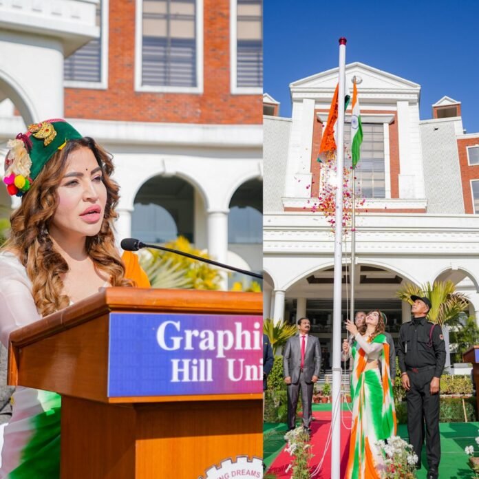 देहरादून, 26 जनवरी। ग्राफिक एरा हिल यूनिवर्सिटी में ग्राफिक एरा ग्रुप ऑफ इंस्टीट्यूशंस की वाइस चेयरपर्सन डॉ राखी घनशाला ने ध्वजारोहण करके परेड की सलामी ली। डॉ राखी घनशाला ने कहा कि गणतंत्र दिवस हमारे अधिकारों के साथ ही कर्तव्यों और जिम्मेदारियों का बोध कराता है।