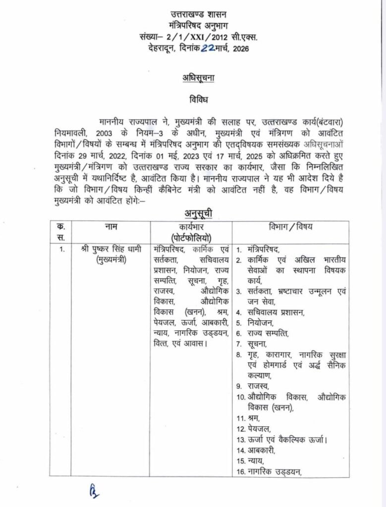 देहरादून। उत्तराखंड सरकार के मंत्रिमंडल विस्तार के बाद नवनियुक्त मंत्रियों सहित सभी सहयोगियों के बीच विभागों के आवंटन की प्रक्रिया पूरी कर ली गई है। मुख्यमंत्री पुष्कर सिंह धामी ने अपनी ‘नई टीम’ के सदस्यों के बीच कार्यक्षेत्रों का विभाजन करते हुए राज्य के विकास को नई ऊंचाई देने का संकल्प दोहराया है। मुख्यमंत्री ने विश्वास जताया है कि सभी मंत्री अपने-अपने विभागों के माध्यम से जनता की अपेक्षाओं पर खरा उतरेंगे। मुख्यमंत्री ने कहा है कि प्रदेश की सरकार के बीते चार साल पूरी तरह से सेवा, सुशासन और जनकल्याण को समर्पित रहे हैं। इसी क्रम में मंत्रिमंडल में नए शामिल सदस्यों सहित सभी सहयोगियों के मध्य कार्य आवंटन भी कर दिया गया है।