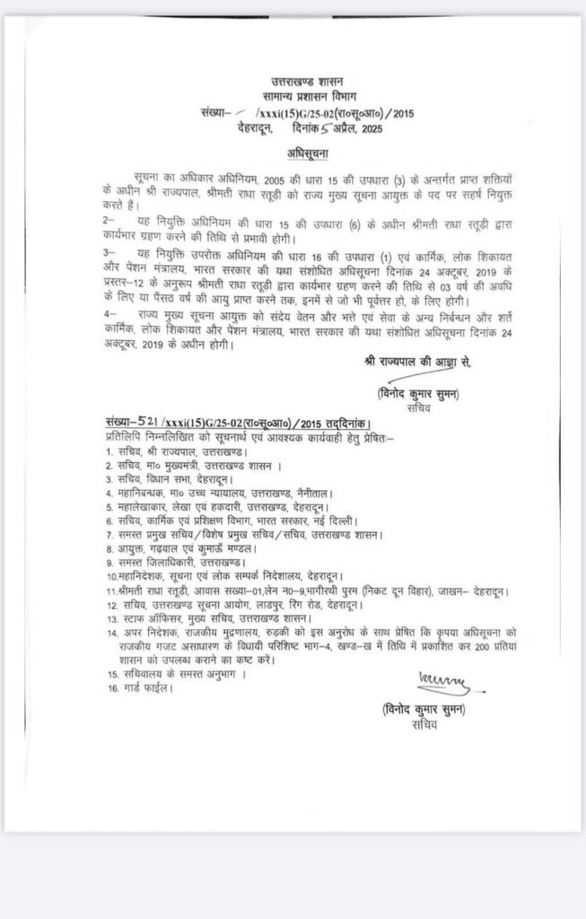 शनिवार, 5 अप्रैल को सचिव विनोद कुमार सुमन द्वारा जारी नियुक्ति आदेश के अनुसार, राधा रतूड़ी का कार्यकाल तीन वर्ष का होगा। इससे पहले, पूर्व आईपीएस अधिकारी दिलीप सिंह कुंवर को भी सूचना आयुक्त के रूप में नियुक्त किया गया था।