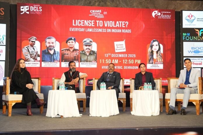 इसके बाद “लाइसेंस टू वायोलेट? एवरीडे लॉलेसनेस ऑन इंडियन रोड्स” सत्र हुआ, जिसमें आईजी नीलेश भर्ने ने ट्रैफिक प्रबंधन के तीन ई—एनफोर्समेंट, इंजीनियरिंग और एजुकेशन—के महत्व पर ज़ोर दिया। एसपी लोकजीत सिंह ने कहा कि दुर्घटनाओं को रोकने के लिए अवसंरचना, जागरूकता और पुलिसिंग का संयोजन आवश्यक है। राहुल कोटियाल ने अव्यवस्थित विकास और नीति की कमी को जिम्मेदार ठहराया, साथ ही सार्वजनिक परिवहन को बढ़ावा देने की आवश्यकता बताई। एडिशनल एसपी जया बलूनी ने बताया कि सड़क अनुशासन केवल डर से नहीं बल्कि जागरूकता और व्यक्तिगत जिम्मेदारी से आता है। सत्र की अध्यक्षता सुप्रिया चंदोक ने की।