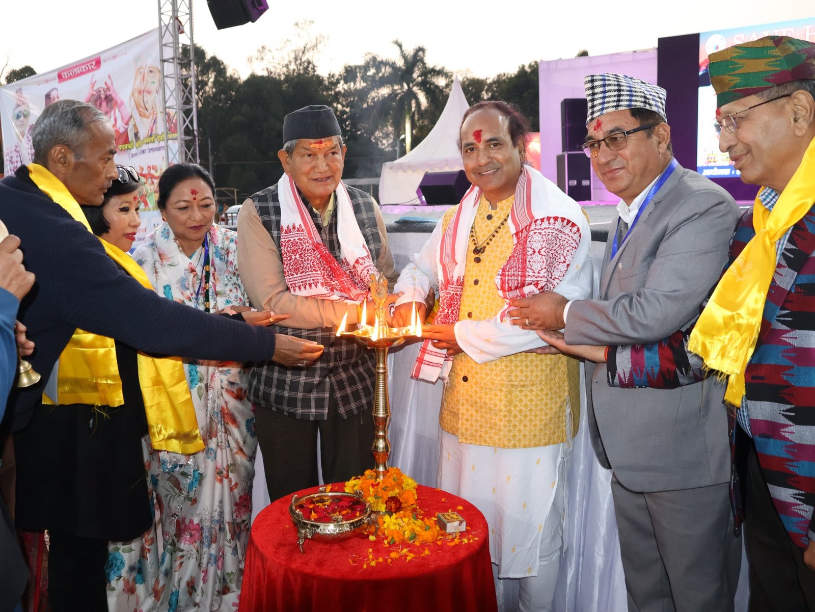 वहीं शाम को बतौर मुख्य अतिथि पूर्व मुख्यमंत्री हरीश रावत सेवानिवृत्त लेफ्टिनेंट जनरल राम सिंह प्रधान, ट्रस्ट के संस्थापक आचार्य पंडित सुशांत राज, ट्रस्ट की अध्यक्ष कमला थापा, सभा के अध्यक्ष पदम सिंह थापा, संरक्षक गोदावरी थापली ने प्रदर्शनी और मेले का शुभारम्भ किया। इस दौरान उत्सव की सांस्कृतिक संध्या सुरों और ताल से सजी रही। इस मौके पर जम्मू के प्रसिद्ध जिया शर्मा एम् जैक्सन बैंड ने ‘कुंजू चंचलो’ (अ ट्रू लव स्टोरी ) और ‘आश्रूआ आ गोरिया’ जैसे गीतों की शानदार प्रस्तुति दी। सिलीगुड़ी की प्रसिद्ध कलाकार सुरक्षा सिन्चुरी ने भाखेमा बर पीपलू, चियाबारिमा, रामभा हो गीतों की शानदार प्रस्तुति दी गई। सिलीगुड़ी के गायक विक्रम कालीकोटी ने अपने गीतों के माध्यम से इंडियन आइडल फेम प्रशांत तमंग को भावपूर्ण श्रद्धांजलि अर्पित की। उन्होंने ‘या आली रहम आ ली’ जैसे गीत भी प्रस्तुत किए।