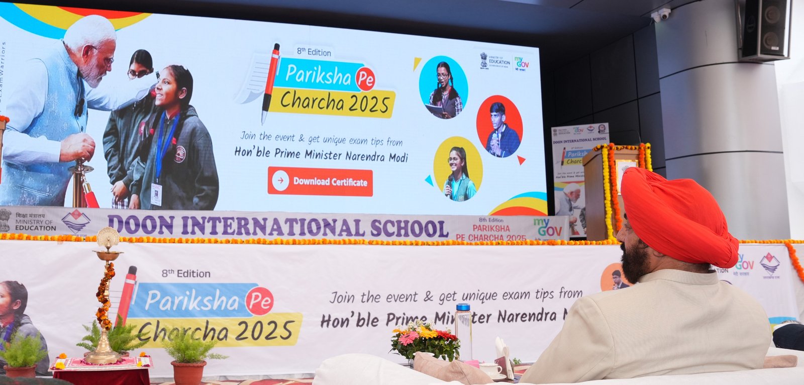 देहरादून 10 फरवरी, 2025 राज्यपाल लेफ्टिनेंट जनरल गुरमीत सिंह (से नि) ने सोमवार को दून इंटरनेशनल स्कूल, डालनवाला, देहरादून में माननीय प्रधानमंत्री श्री नरेंद्र मोदी के ‘‘परीक्षा पे चर्चा-2025’’ कार्यक्रम को सुना। इस कार्यक्रम में प्रधानमंत्री ने विद्यार्थियों से संवाद करते हुए उन्हें परीक्षा के तनाव को प्रबंधित करने, आत्मविश्वास बनाए रखने और मानसिक रूप से सशक्त रहने के लिए उपयोगी सुझाव दिए।