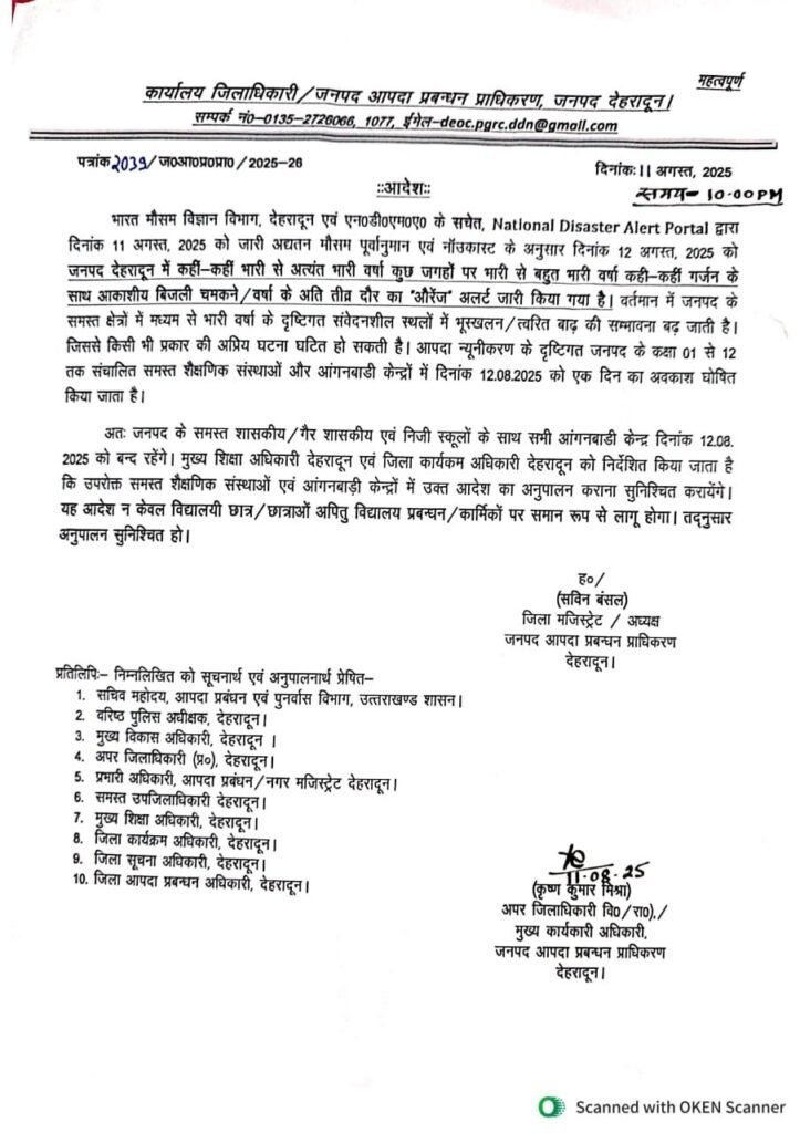 जिलाधिकारी देहरादून सविन बंसल ने बताया कि वर्तमान में जनपद के विभिन्न क्षेत्रों में मध्यम से भारी वर्षा हो रही है, जिससे संवेदनशील स्थलों पर भूस्खलन एवं त्वरित बाढ़ की सम्भावना बढ़ गई है। जन सुरक्षा को ध्यान में रखते हुए आपदा न्यूनीकरण के तहत जनपद की समस्त शासकीय, अशासकीय एवं निजी शैक्षणिक संस्थाएं—कक्षा 01 से 12 तक—तथा सभी आंगनबाड़ी केन्द्रों में 12 अगस्त, 2025 को एक दिन का अवकाश घोषित किया गया है।