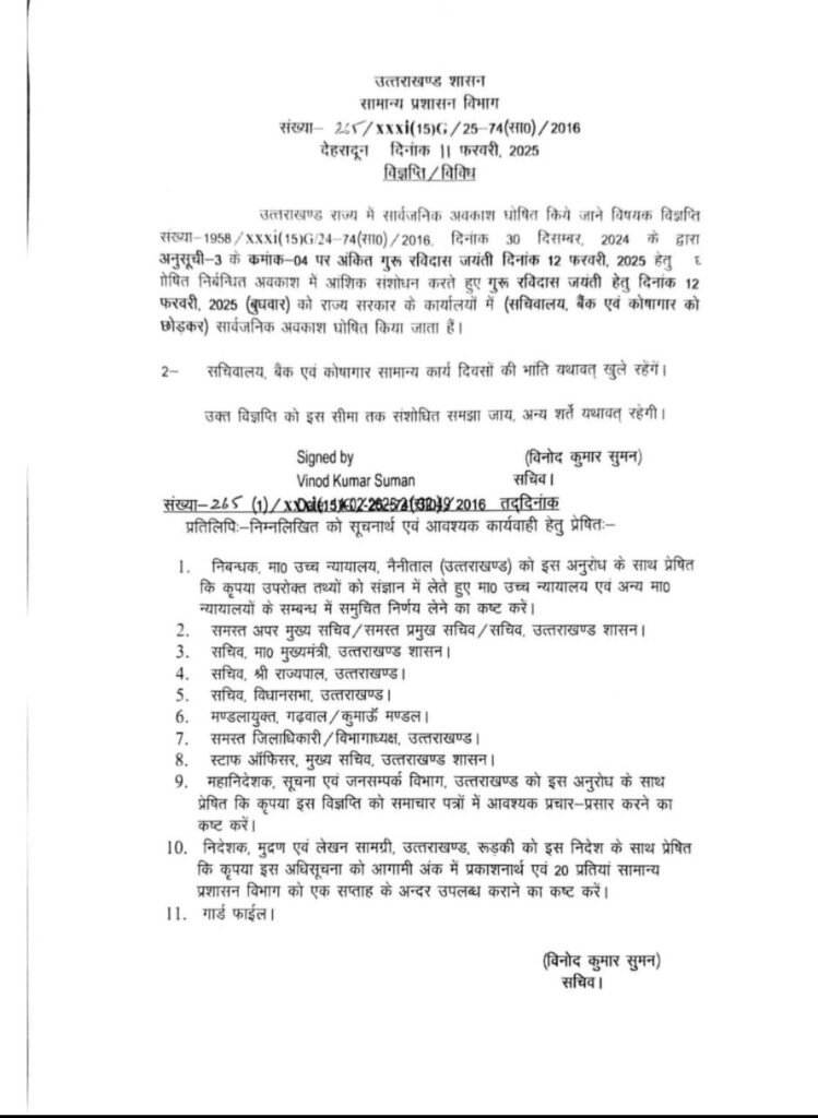 देहरादून,11फरवरी2025(आरएनएस)गुरु रविदास जयन्ती के अवसर पर प्रदेश में सार्वजनिक अवकाश की घोषणा की गई है। सचिवालय और कोषागार को छोड़कर राज्य सरकार के सभी कार्यालय, संस्थान और शैक्षणिक संस्थान इस दिन बंद रहेंगे।