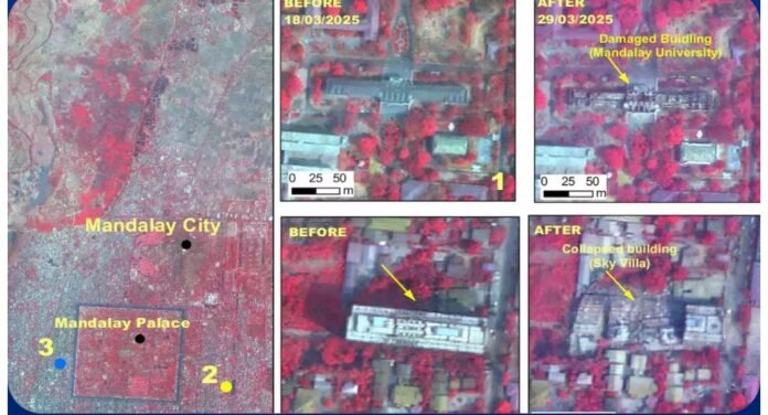तस्वीरों में म्यांमार के मांडले और सगाइंग शहरों में ध्वस्त इमारतों, सडक़ों, ऐतिहासिक स्थलों और ब्रिज के पहले और बाद के दृश्यों को दिखाया गया है।
