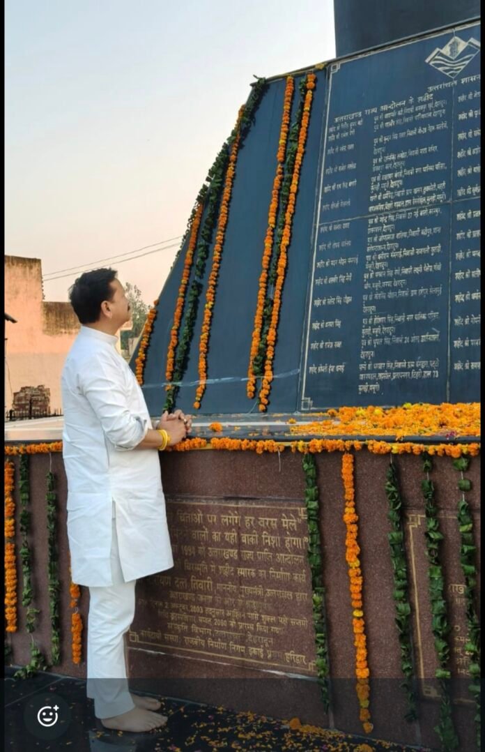 मुज़फ्फरनगर/देहरादून। उत्तराखंड प्रदेश कांग्रेस अध्यक्ष करन माहरा ने मंगलवार को मुज़फ्फरनगर स्थित रामपुर तिराहा पहुंचकर राज्य आंदोलन के वीर शहीदों को भावपूर्ण श्रद्धांजलि अर्पित की। माहरा ने कहा कि राज्य आंदोलन के दौरान हुए बलिदान उत्तराखंड की अस्मिता की नींव हैं और इन शहीदों के सपनों का उत्तराखंड बनाना ही सच्ची श्रद्धांजलि होगी।