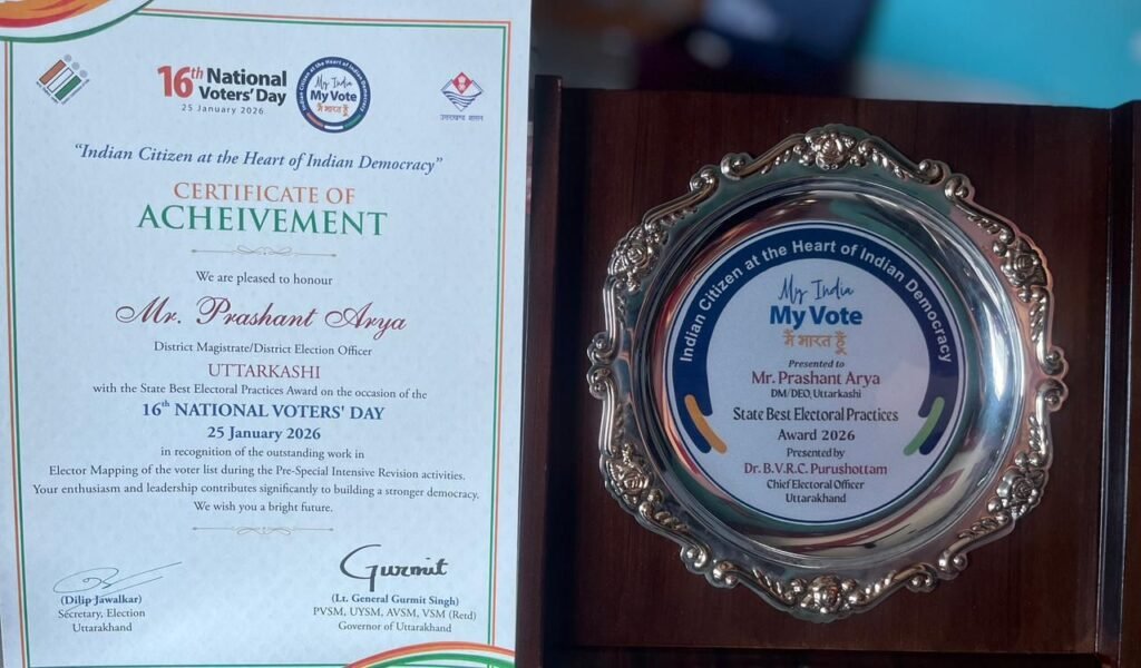 जिलाधिकारी प्रशांत आर्य के अनुकरणीय नेतृत्व, मार्गदर्शन और उत्कृष्टता के प्रति समर्पण में पूर्व-पुनरावलोकन कार्य में उत्तरकाशी जिले के उत्कृष्ट प्रदर्शन के लिए यह अवॉर्ड मिला है। जिसे एनवीडी-2026 में प्रमाण पत्र और स्मृति चिन्ह से सम्मानित किया गया है। इस कार्यक्रम में जिलाधिकारी महोदय के प्रतिनिधि के तौर पर अपर जिलाधिकारी मुक्ता मिश्र द्वारा प्रतिभाग किया गया।