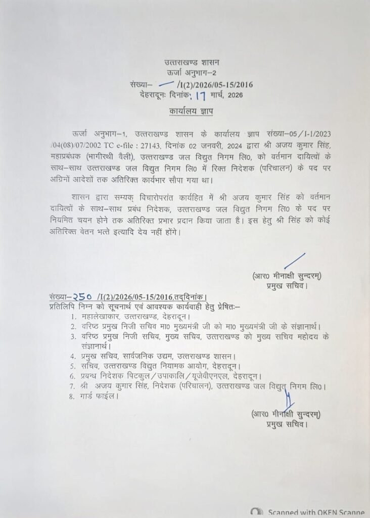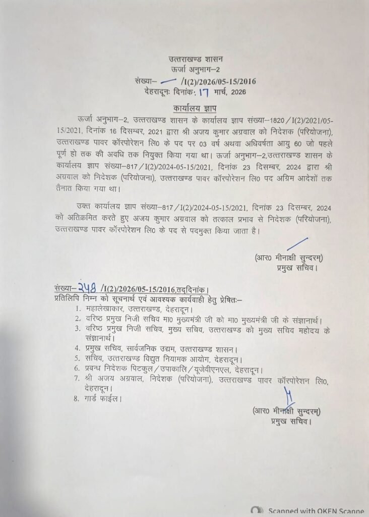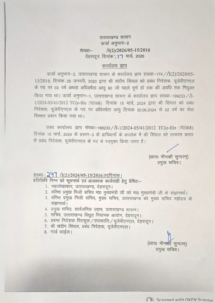 देहरादून। प्रदेश की पुष्कर सिंह धामी सरकार ने मंगलवार देर रात बड़ा प्रशासनिक एक्शन लेते हुए ऊर्जा क्षेत्र के दो प्रमुख निगमों के प्रबंध निदेशकों (एमडी) समेत कई वरिष्ठ अधिकारियों को तत्काल प्रभाव से पदमुक्त कर दिया। ये सभी अधिकारी सेवानिवृत्त होने के बाद सरकार द्वारा दिए गए सेवा विस्तार (एक्सटेंशन) पर कार्यरत थे।