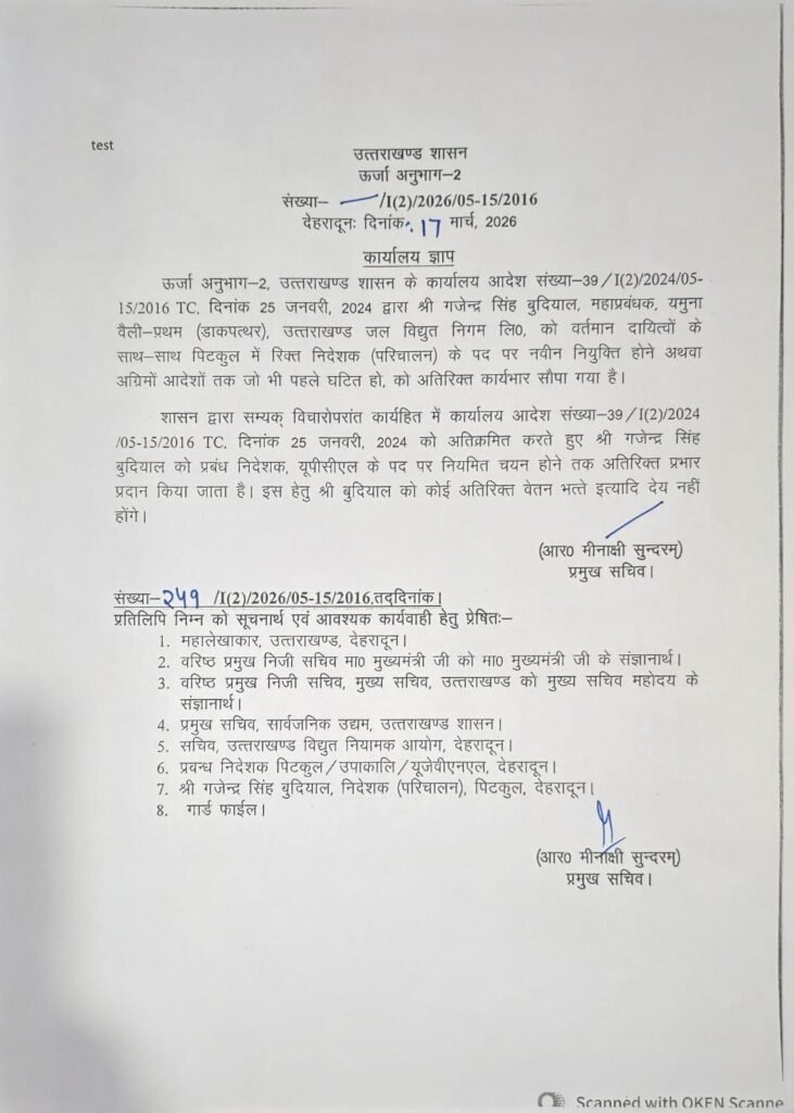 ऊर्जा सचिव आर. मीनाक्षी सुंदरम की ओर से जारी आदेश के अनुसार, यूपीसीएल के एमडी अनिल कुमार को 30 जून 2024 को सेवानिवृत्ति के बाद दो वर्ष का कार्यकाल विस्तार दिया गया था। अब उन्हें पदमुक्त कर दिया गया है। उनकी जगह यूजेवीएनएल में महाप्रबंधक (भागीरथी वैली) और पिटकुल में प्रभारी निदेशक (परिचालन) गजेंद्र सिंह बुदियाल को यूपीसीएल का एमडी बनाया गया है।