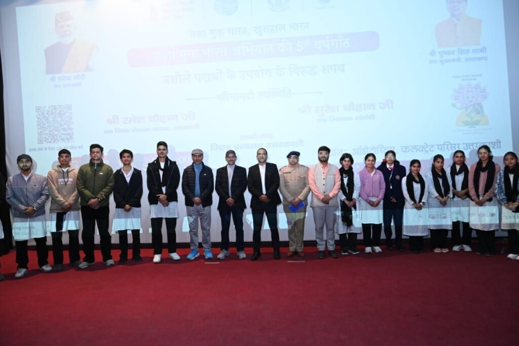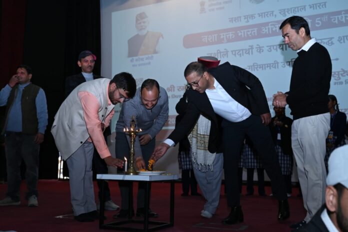 उत्तरकाशी – नशामुक्त भारत अभियान की पाँचवीं वर्षगांठ के अवसर पर मंगलवार को जिला प्रेक्षागृह में व्यापक जन-जागरूकता कार्यक्रम आयोजित किया गया। कार्यक्रम का शुभारंभ अध्यक्ष जिला पंचायत रमेश चौहान, क्षेत्रीय विधायक सुरेश चौहान एवं जिलाधिकारी प्रशान्त आर्य ने संयुक्त रूप से दीप प्रज्ज्वलन कर किया।