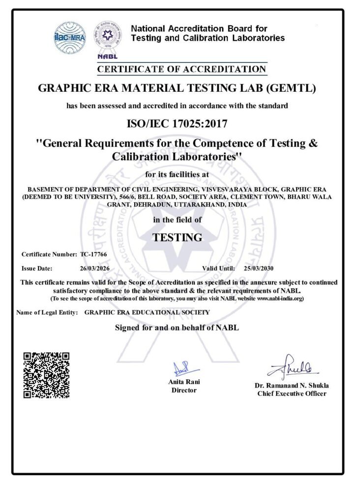 देहरादून  । ग्राफिक एरा यूनिवर्सिटी में अब सड़कों, पुलों और इमारतों में इस्तेमाल की गई सामग्री की गुणवत्ता की जांच भी होगी। नेशनल एक्रीडिटेशन बोर्ड फॉर टेस्टिंग एंड कैलिब्रेशन लैबोरेट्रीज  (एनएबीएल) ने इसके लिए ग्राफिक एरा डीम्ड यूनिवर्सिटी को मान्यता दी है।