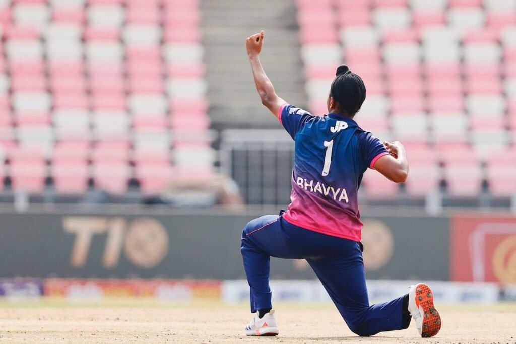 डकवर्थ-लुईस-सर्न (DLS) विधि के अनुसार टाइटंस का लक्ष्य 65 रन कर दिया गया, जिससे शुरू से आक्रामक रुख अपनाना जरूरी था। कप्तान विजय शर्मा ने वही किया—सिर्फ 10 गेंदों पर 29 रन की ताबड़तोड़ पारी (स्ट्राइक रेट 290), जिससे मुकाबले का रुख पहले ही ओवरों में टाइटंस के पक्ष में झुका दिया।