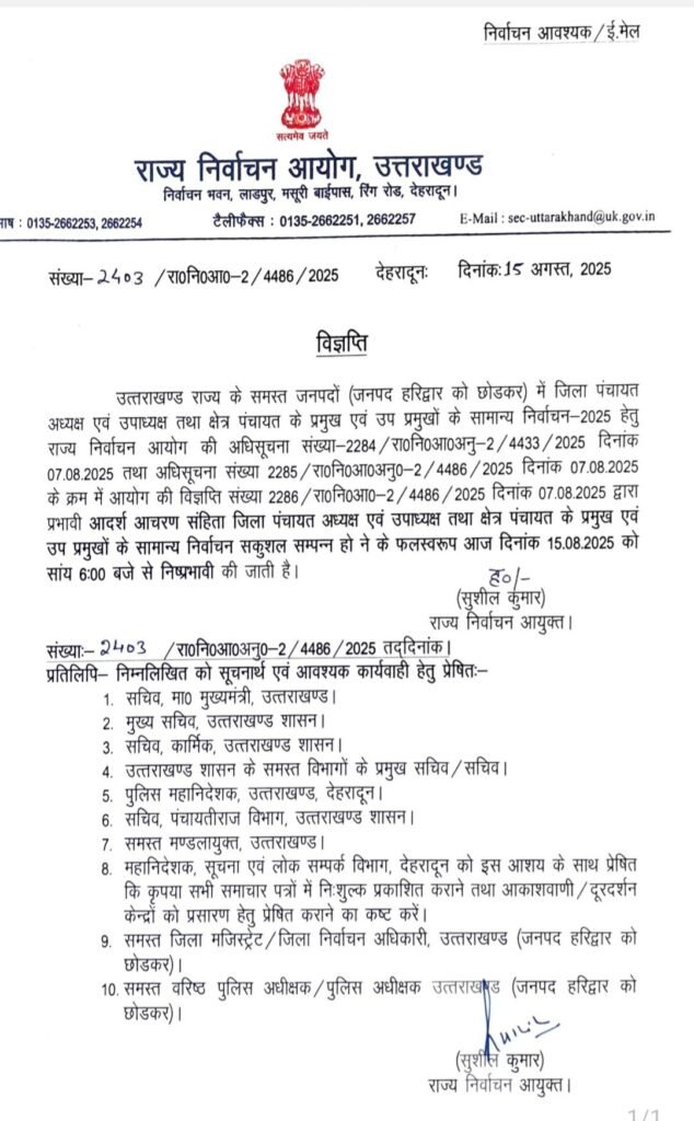 देहरादून, 15 अगस्त।उत्तराखंड राज्य निर्वाचन आयोग ने घोषणा की है कि जिला पंचायत अध्यक्ष एवं उपाध्यक्ष तथा क्षेत्र पंचायत के प्रमुख एवं उप प्रमुखों के सामान्य निर्वाचन-2025 के लिए लागू आदर्श आचार संहिता आज शाम 6 बजे से समाप्त हो गई है। यह आदेश राज्य के सभी जनपदों (जनपद हरिद्वार को छोड़कर) में लागू होगा।
