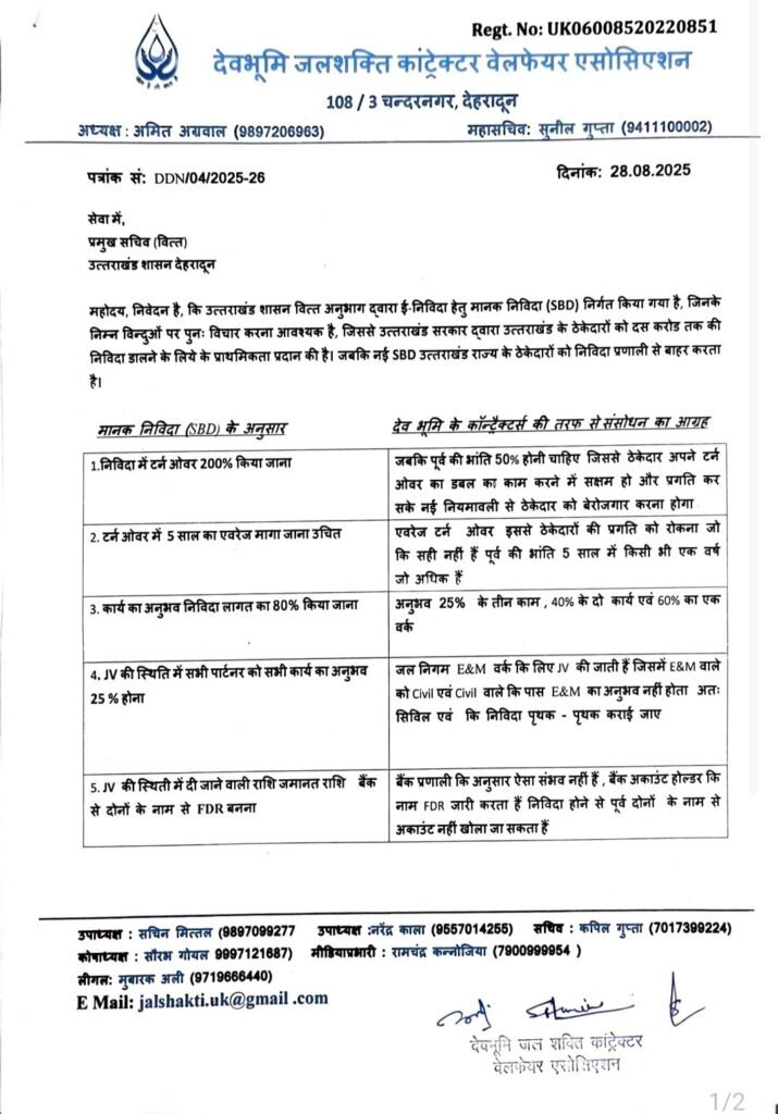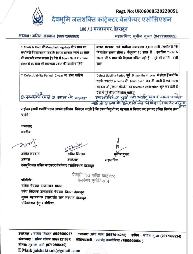 देहरादून, 31 अगस्त 2025: देवभूमि जल शक्ति कॉन्ट्रैक्टर वेलफेयर एसोसिएशन की पहल पर उत्तराखंड सरकार राज्य के छोटे और मझोले ठेकेदारों के लिए नई नियमावली में संशोधन करने पर विचार कर रही है। एसोसिएशन द्वारा दिए गए सुझावों पर 28 अगस्त को शासन और 30 अगस्त को उत्तराखंड पेयजल निगम के अधिकारियों के साथ हुई बैठकों में गहन चर्चा हुई।