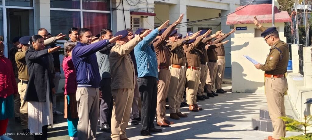 पौड़ी। “नशा मुक्त भारत अभियान” की पाँचवीं वर्षगांठ के अवसर पर आज जनपद पौड़ी में सभी थाना एवं कार्यालय स्तर पर विशेष शपथ कार्यक्रम आयोजित किए गए। इस अवसर पर पौड़ी पुलिस के अधिकारी एवं कर्मचारीगणों ने सामूहिक रूप से जनपद को नशा मुक्त बनाने की शपथ ली। साथ ही क्षेत्राधिकारी श्रीनगर श्री अनुज कुमार द्वारा मेडिकल कॉलेज श्रीकोट में जाकर छात्र-छात्राओं को नशा मुक्ति की शपथ दिलाकर नशे के दुष्प्रभावों के सम्बन्ध में बताया गया।