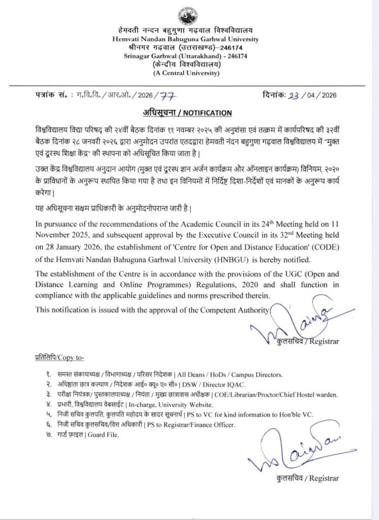 श्रीनगर (गढ़वाल)। हेमवती नंदन बहुगुणा गढ़वाल विश्वविद्यालय ने विश्वविद्यालय में मुक्त एवं दूरस्थ शिक्षा केन्द्र स्थापित करने की अधिसूचना जारी कर दी है। यह निर्णय विश्वविद्यालय की 24वीं विद्यापरिषद् की बैठक में केन्द्र स्थापना की अनुशंसा के बाद, कार्यपरिषद् की 32वीं बैठक में अनुमोदित किया गया।