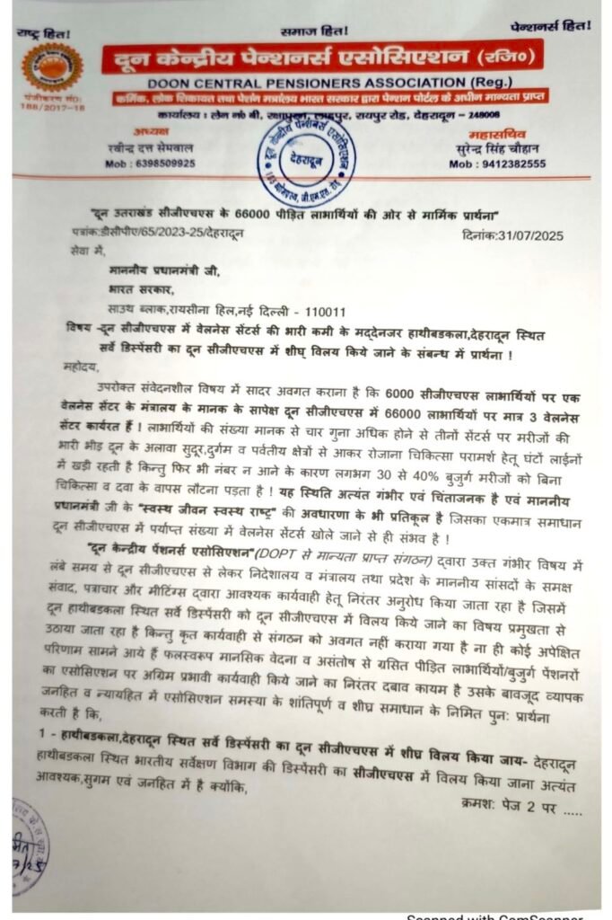 पत्र में बताया गया है कि हाथीबड़कला सर्वे डिस्पेंसरी में 17 कमरों का विशाल भवन, चार डॉक्टर और पूरा स्वीकृत स्टाफ होते हुए भी प्रतिदिन केवल 5 से 10 मरीज ही पहुंच रहे हैं, जिससे सरकारी संसाधनों और मानवबल का स्पष्ट दुरुपयोग हो रहा है। वहीं दूसरी ओर दून सीजीएचएस केंद्रों में प्रतिदिन 100 से 150 मरीज प्रति डॉक्टर का भार है, जिससे 30 से 40 प्रतिशत बुजुर्ग बिना उपचार के लौटने को मजबूर हैं। यह स्थिति न केवल गंभीर है, बल्कि प्रधानमंत्री की “स्वस्थ जीवन, स्वस्थ राष्ट्र” की परिकल्पना के भी विपरीत है।