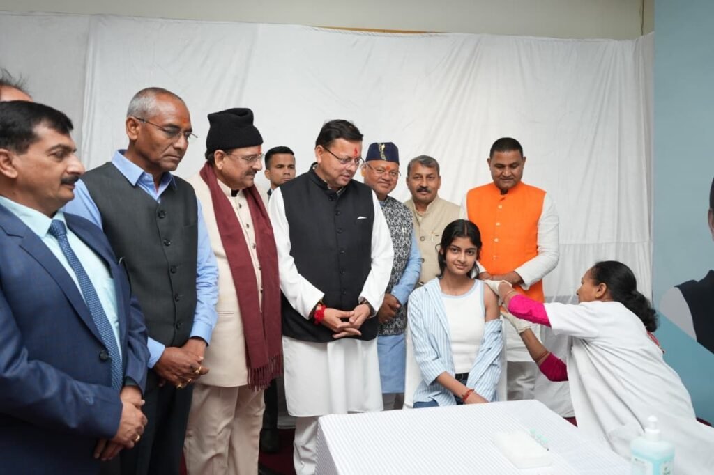 मुख्यमंत्री ने बताया कि राजस्थान के अजमेर से प्रधानमंत्री द्वारा प्रारंभ किए गए इस अभियान के अंतर्गत देशभर में 14 वर्ष की लगभग 1 करोड़ 15 लाख से अधिक किशोरियों को मुफ्त एचपीवी वैक्सीन दी जाएगी। मुख्यमंत्री ने कहा कि उत्तराखंड राज्य में भी इस अभियान के प्रथम चरण में 155 केंद्रों पर व्यापक स्तर पर टीकाकरण की व्यवस्था सुनिश्चित की गई है। इस अभियान की सफलता के लिए डॉक्टरों, नर्सों, एएनएम, आशा और आंगनवाड़ी कार्यकर्ताओं को प्रशिक्षित किया गया है ताकि कोल्ड-चेन व्यवस्था मजबूत हो। मुख्यमंत्री ने अभियान को सफल बनाने के लिए प्रदेश के सभी फ्रंटलाइन हेल्थ वॉरियर्स का आभार व्यक्त करते हुए कहा कि प्रधानमंत्री ने देश के प्रत्येक नागरिक के लिए गुणवत्तापूर्ण स्वास्थ्य सेवाएँ सुनिश्चित करने का संकल्प लिया है और उसे प्रभावी रूप से धरातल पर उतारा है। देश में स्वास्थ्य सेवाओं में व्यापक परिवर्तन देखने को मिला है। पहले जहाँ देश में 387 मेडिकल कॉलेज थे, आज वे बढ़कर 819 हो गए हैं। आज मेडिकल छात्रों की संख्या में डेढ़ गुना से अधिक की वृद्धि हुई है। केंद्र सरकार ने पिछले 11 वर्षों में 23 नए एम्स बनाकर देश के मेडिकल इंफ्रास्ट्रक्चर को मजबूती प्रदान करने का कार्य किया है। मुख्यमंत्री ने कहा कि विश्व की सबसे बड़ी स्वास्थ्य सुरक्षा योजना आयुष्मान भारत हमारे देश में संचालित की जा रही है, जिसके माध्यम से देश के करोड़ों परिवारों को प्रति वर्ष 5 लाख रुपये तक का निःशुल्क उपचार उपलब्ध कराया जा रहा है। उन्होंने कहा कि मातृशक्ति के कल्याण के लिए भी सरकार द्वारा विभिन्न योजनाएँ संचालित की जा रही हैं। प्रधानमंत्री उज्ज्वला योजना से करोड़ों माताओं और बहनों को चूल्हे के धुएँ से मुक्ति मिली है।