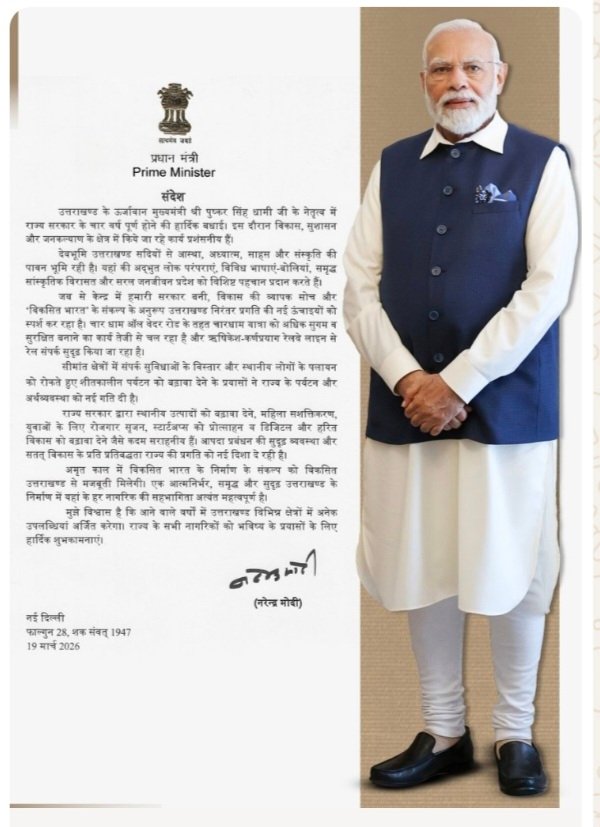 प्रधानमंत्री ने प्रदेश के सीमांत क्षेत्रों में कनेक्टिविटी बढ़ाने और शीतकालीन पर्यटन को प्रोत्साहित करने के प्रयासों को भी सराहा। उन्होंने कहा कि इन पहलों से न केवल पर्यटन को बढ़ावा मिला है, बल्कि पलायन रोकने और स्थानीय अर्थव्यवस्था को सशक्त बनाने में भी मदद मिली है। अपने संदेश में प्रधानमंत्री ने राज्य सरकार द्वारा स्थानीय उत्पादों के प्रोत्साहन, महिला सशक्तिकरण, युवाओं के लिए रोजगार सृजन, स्टार्टअप्स को बढ़ावा तथा डिजिटल और हरित विकास जैसे प्रयासों को सराहनीय बताया। साथ ही, आपदा प्रबंधन की सुदृढ़ व्यवस्था और सतत विकास के प्रति प्रतिबद्धता को राज्य की प्रगति के लिए महत्वपूर्ण बताया।