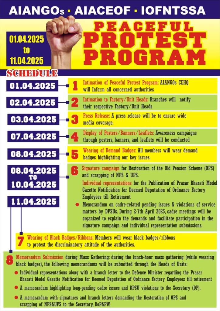 देहरादून, 3 अप्रैल2025(मेरोउत्तराखंड) देशभर की आयुध निर्माणियों के गैर-राजपत्रित अधिकारियों के संगठन AIANGOs (All India Association of Non-Gazetted Officers of Ordnance & Equipment Factories and Quality Assurance Organizations) ने अपनी विभिन्न मांगों को लेकर राष्ट्रव्यापी विरोध प्रदर्शन शुरू कर दिया है। यह प्रदर्शन 1 अप्रैल से 11 अप्रैल तक चलेगा, जिसमें देश की 41 आयुध निर्माणियों के कर्मचारी भाग ले रहे हैं। संगठन के अनुसार, यह आंदोलन कर्मचारियों के हितों की रक्षा करने और उनकी जायज़ मांगों को सरकार तक पहुंचाने के लिए किया जा रहा है।