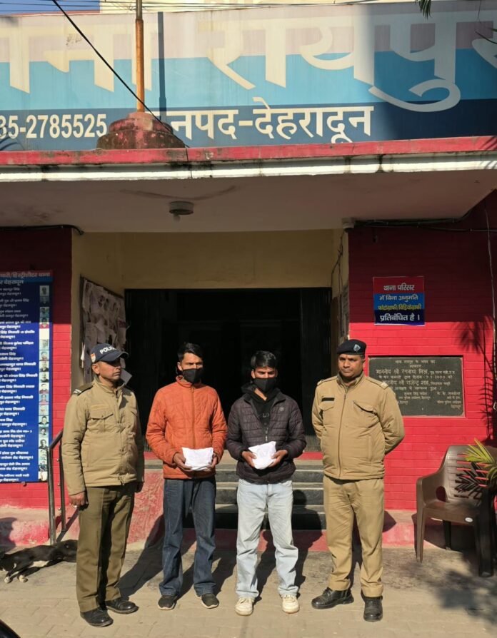 पुलिस के अनुसार, 26 दिसंबर को मालदेवता क्षेत्र में चेकिंग के दौरान मुखबिर की सूचना पर दो लोगों को पकड़ा गया। गिरफ्तार आरोपियों की पहचान हरदयाल सिंह (34 वर्ष) पुत्र चक्रसिंह और मनोज सिंह (19 वर्ष) पुत्र वीरेंद्र सिंह, निवासी ग्राम लिवाड़ी, तहसील मोरी, जिला उत्तरकाशी के रूप में हुई है।