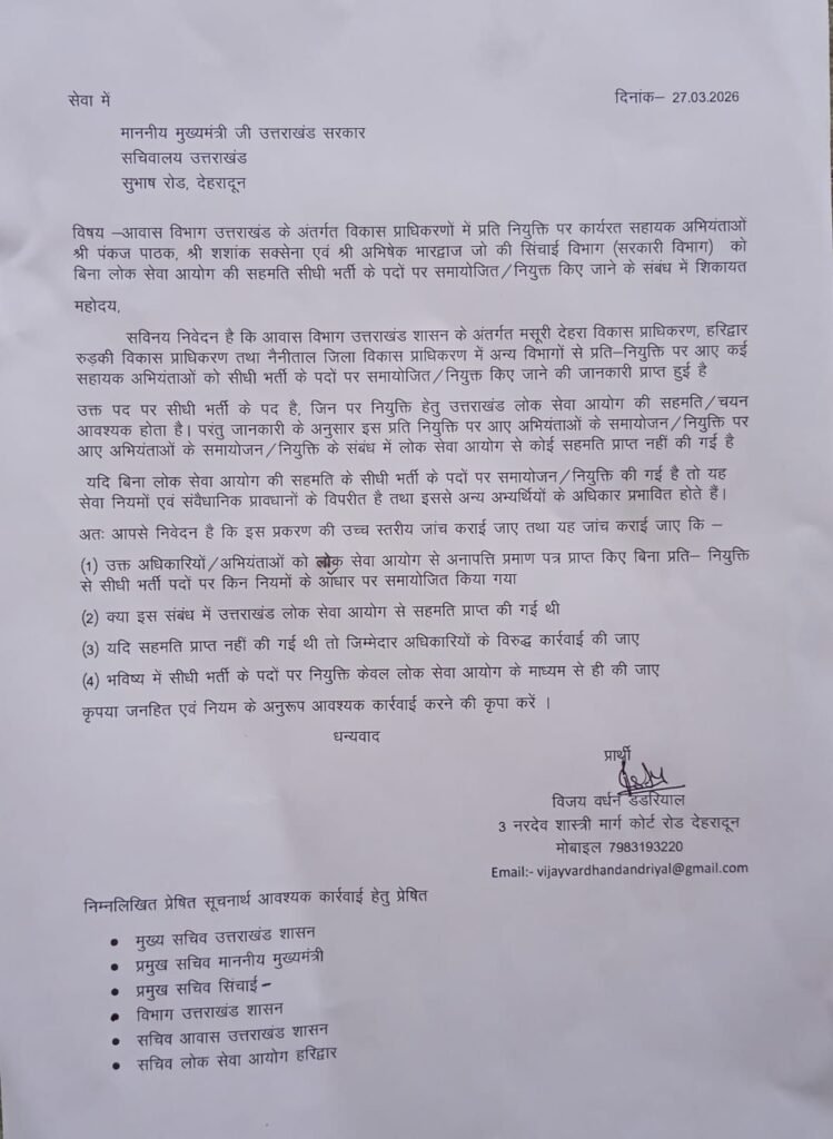 इस मामले को लेकर सामाजिक कार्यकर्ता विजय वर्धन डंडरियाल ने मुख्यमंत्री को पत्र लिखकर कठोर कार्रवाई की मांग की है। उन्होंने पत्र में आरोप लगाया है कि सिंचाई विभाग में मूल रूप से तैनात श्री पंकज पाठक, श्री शशांक सक्सेना और श्री अभिषेक भारद्वाज को प्रतिनियुक्ति के माध्यम से विकास प्राधिकरणों में लाकर सीधी भर्ती वाले पदों पर समायोजित कर दिया गया।