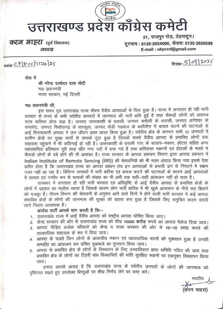 देहरादून: उत्तराखंड प्रदेश कांग्रेस कमेटी के अध्यक्ष करन माहरा ने राज्य में आई आपदाओं को देखते हुए प्रधानमंत्री नरेंद्र मोदी से ₹20,000 करोड़ के विशेष राहत पैकेज की मांग की है। उन्होंने यह मांग प्रधानमंत्री को लिखे 5 सितंबर के पत्र में भी दोहराई है। माहरा का कहना है कि राज्य को हुए भारी नुकसान को देखते हुए, पहले मांगी गई ₹10,000 करोड़ की राशि अब नाकाफी है। उन्होंने यह भी कहा कि धामी सरकार ने केंद्र से केवल ₹5,700 करोड़ की मांग की है, जबकि अकेले जोशीमठ के पुनर्निर्माण के लिए ही लगभग ₹6,000 करोड़ की आवश्यकता होगी।