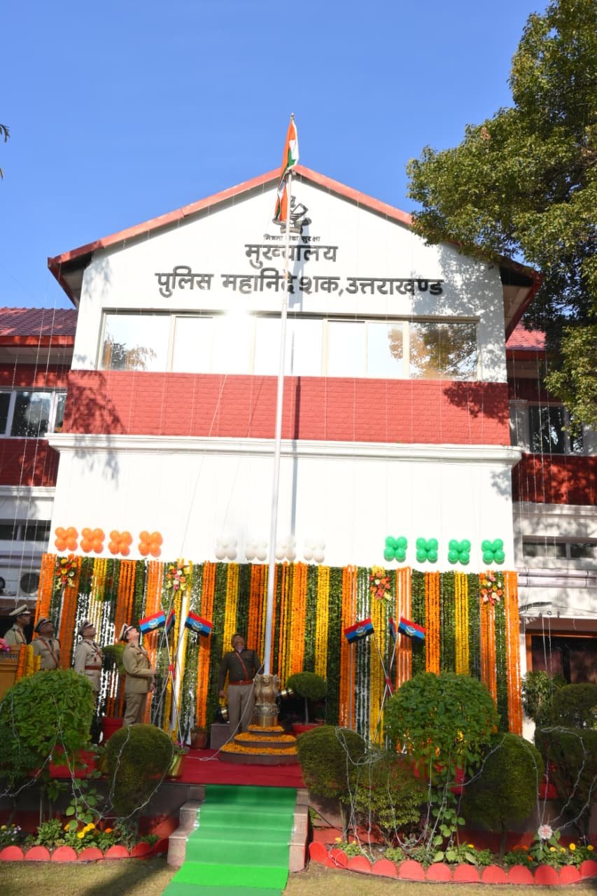 देहरादून। गणतंत्र दिवस-2026 के पावन अवसर पर पुलिस मुख्यालय, उत्तराखंड देहरादून में आयोजित समारोह में पुलिस महानिदेशक दीपम सेठ ने ध्वजारोहण कर सभी को संविधान की उद्देशिका की शपथ दिलाई। इस अवसर पर उत्कृष्ट प्रदर्शन करने वाले पुलिस कर्मियों को सम्मानित किया गया, जिसमें फायर स्टेशन टनकपुर, जनपद चंपावत को *बेस्ट फायर स्टेशन* की ट्रॉफी प्रदान की गई। साथ ही, गणतंत्र दिवस-2026 के अवसर पर पुलिस कर्मियों को *“डीजीपी डिस्क गोल्ड”* एवं *“डीजीपी डिस्क सिल्वर”* से नवाजा गया।