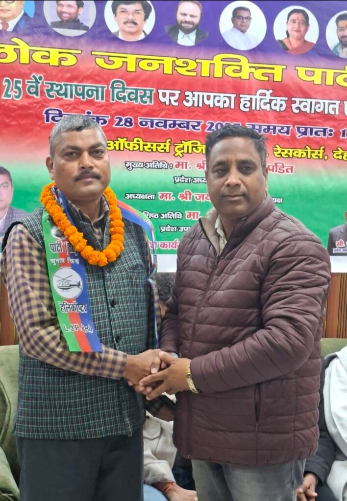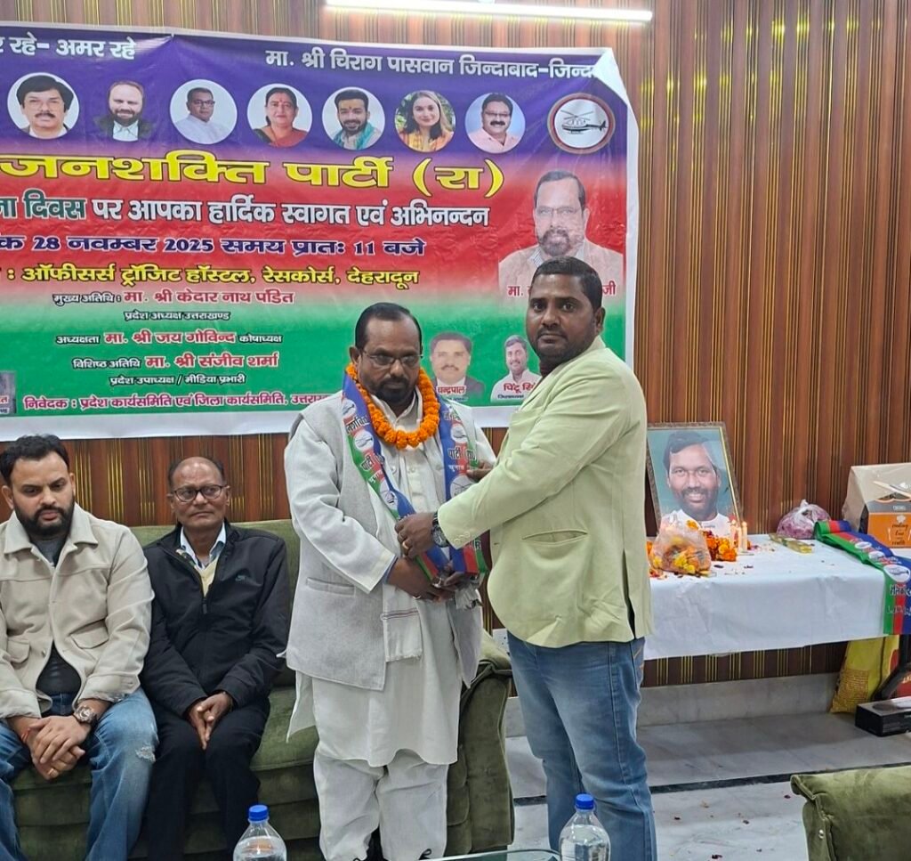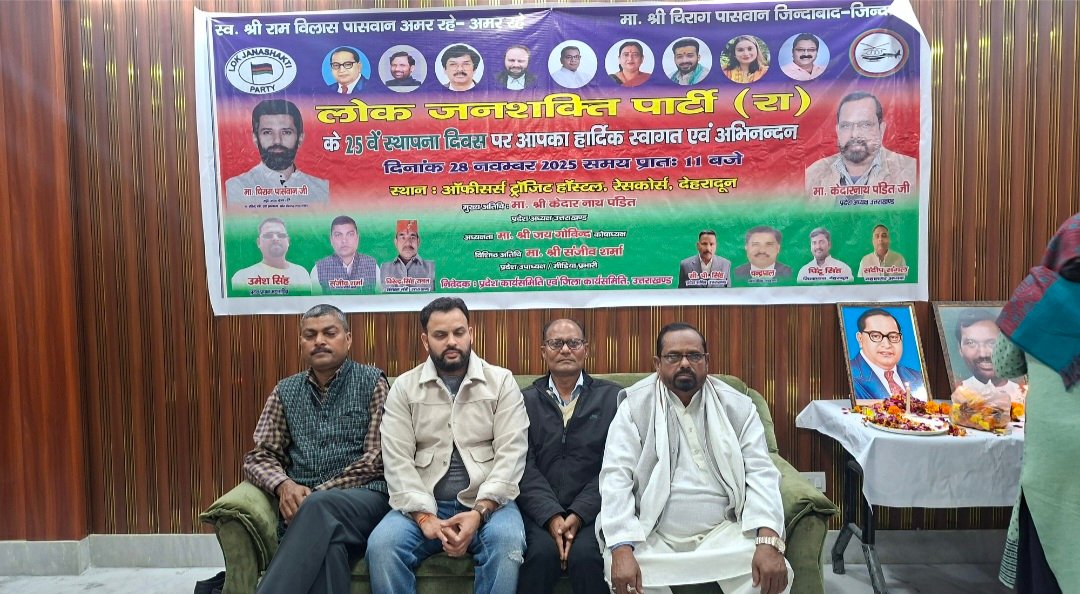 देहरादून : लोक जनशक्ति पार्टी (रामविलास) का 25 वा स्थापना दिवस उत्तराखंड की राजधानी देहरादून के रेस कोर्स ऑफिसर्स ट्रांजिट हॉस्टल में धूमधाम से मनाया गया | कार्यक्रम में मुख्य अतिथि प्रदेश अध्यक्ष केदारनाथ पंडित, कोषाध्यक्ष जय गोविंद एवं वशिष्ठ अतिथि प्रदेश उपाध्यक्ष एवं मीडिया प्रभारी संजीव शर्मा उपस्थित रहे | सर्वप्रथम संविधान रचयिता बाबा भीमराव अंबेडकर एवं लोक जनशक्ति पार्टी के संस्थापक एव हमारे अभिभावक आदरणीय स्वर्गीय श्री रामविलास पासवान जी के चित्रों पर फूल माला से श्रद्धांजलि दी गई, उसके बाद कार्यक्रम के मुख्य अतिथि केदारनाथ पंडित ने कहा कि बिहार चुनाव के बाद पार्टी में एक नया जोश और बल आया है आगामी 2027 में विधानसभा चुनाव के दौरान भी यही जोश हमे देखने को मिलेगा ।