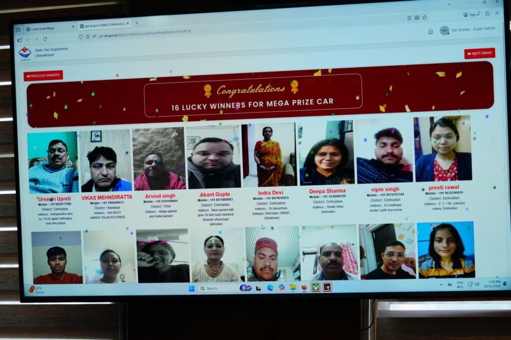 देहरादून। मुख्यमंत्री पुष्कर सिंह धामी ने राज्य स्थापना रजत जयंती समारोह का शुभारंभ करते हुए शुक्रवार को सचिवालय में ‘बिल लाओ, ईनाम पाओ’ के अंतर्गत मेगा लकी ड्रॉ निकाला। राज्य कर विभाग, उत्तराखंड द्वारा आयोजित इस कार्यक्रम में कुल 1888 लकी ड्रॉ विजेता चुने गए। नैनीताल जनपद की सोनिया और टिहरी जनपद के जसपाल रावत ने प्रथम विजेता के रूप में एक-एक इलेक्ट्रिक कार जीती।