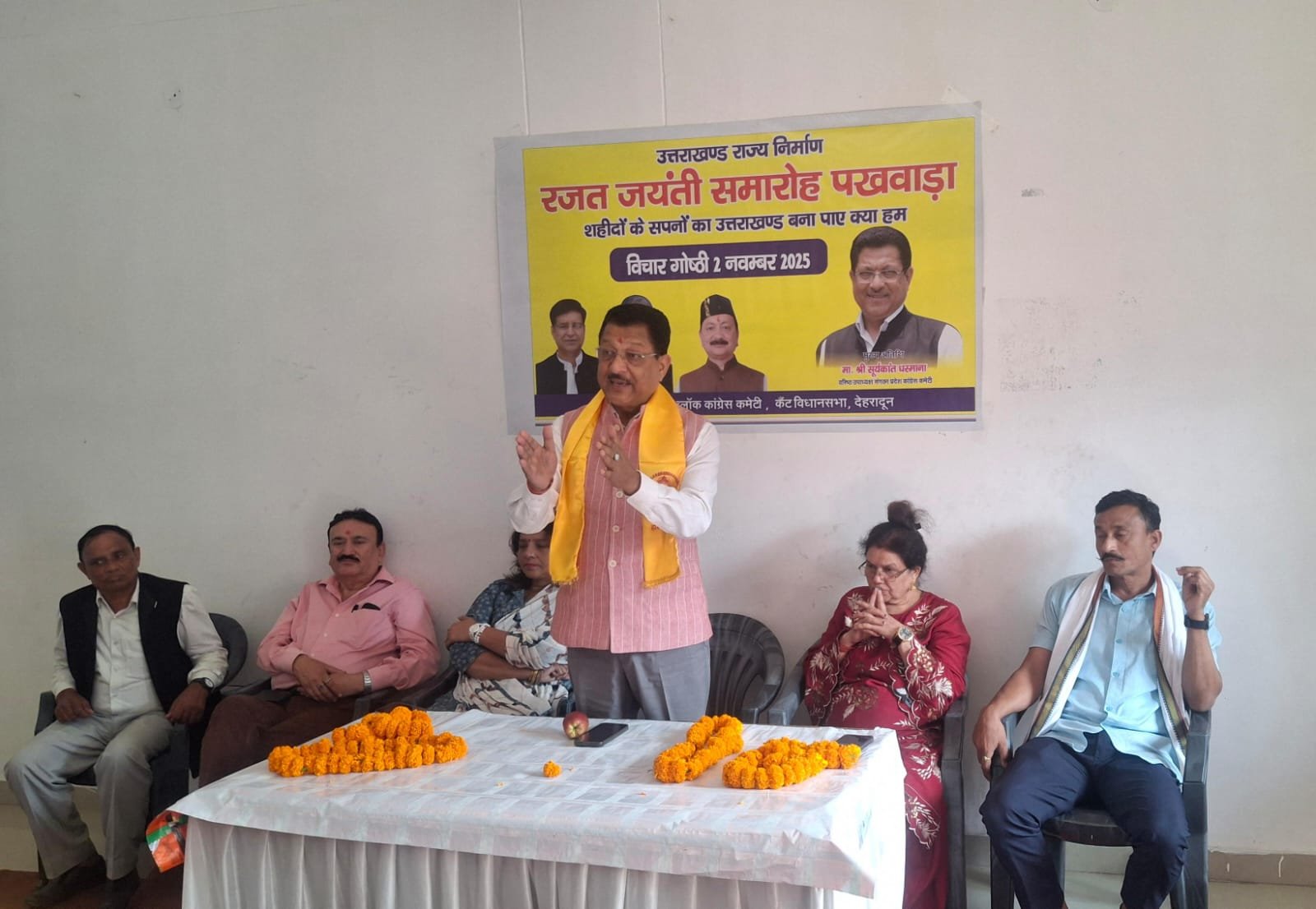 देहरादून – उत्तराखंड प्रदेश कांग्रेस कमेटी द्वारा राज्य के निर्माण की रजत जयंती पखवाड़े के तहत प्रदेश भर में ब्लॉक कांग्रेस कमेटियों ने विचार गोष्ठियों का आयोजन किया। देहरादून में कैंट विधान सभा क्षेत्र के यमुना कॉलोनी प्रेमनगर व कौलागढ़ ब्लॉक कांग्रेस कमेटी द्वारा आयोजित “क्या शहीदों के सपनों का उत्तराखंड बना पाए हम २५ सालों में” विषय पर बोलते हुए गोष्ठी के मुख्य अतिथि उत्तराखंड प्रदेश कांग्रेस कमेटी के वरिष्ठ उपाध्यक्ष संगठन सूर्यकांत धस्माना ने कहा कि राज्य निर्माण के बाद से अब तक का जो रास्ता तय किया गया है, उसमें हम कहां पहुंचे और क्या पाया, क्या खोया, इसका आंकलन करना आवश्यक है।