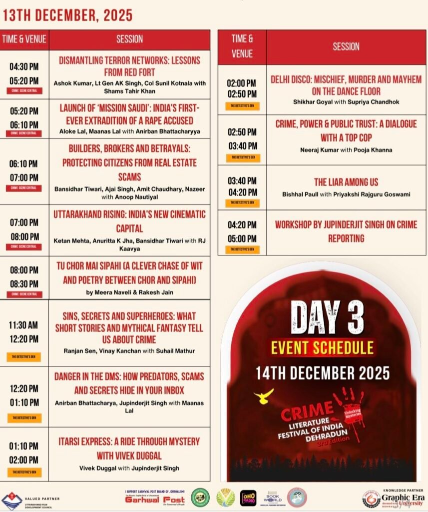 देहरादून : दून कल्चरल एंड लिटरेरी सोसाइटी (डीसीएलएस) द्वारा आयोजित क्राइम लिटरेचर फेस्टिवल अपनी प्रतीक्षित तीसरी संस्करण के साथ 12 से 14 दिसंबर तक होटल हयात सेंट्रिक, देहरादून में आयोजित किया जा रहा है। 12 दिसंबर को होने वाले उद्घाटन समारोह में उत्तराखंड के राज्यपाल लेफ्टिनेंट जनरल गुरमीत सिंह (सेवानिवृत्त) मुख्य अतिथि होंगे, जबकि प्रसिद्ध फिल्म निर्देशक केतन मेहता सम्मानित अतिथि के रूप में उपस्थित रहेंगे।
