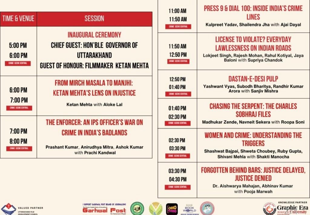 उत्तराखंड के राज्यपाल ले. जनरल (सेनि.) गुरमीत सिंह करेंगे उद्घाटन, पहले दिन मुख्य अतिथि होंगे फिल्म निर्देशक केतन मेहता देहरादून : दून कल्चरल एंड लिटरेरी सोसाइटी (डीसीएलएस) द्वारा आयोजित क्राइम लिटरेचर फेस्टिवल अपनी प्रतीक्षित तीसरी संस्करण के साथ 12 से 14 दिसंबर तक होटल हयात सेंट्रिक, देहरादून में आयोजित किया जा रहा है। 12 दिसंबर को होने वाले उद्घाटन समारोह में उत्तराखंड के राज्यपाल लेफ्टिनेंट जनरल गुरमीत सिंह (सेवानिवृत्त) मुख्य अतिथि होंगे, जबकि प्रसिद्ध फिल्म निर्देशक केतन मेहता सम्मानित अतिथि के रूप में उपस्थित रहेंगे।